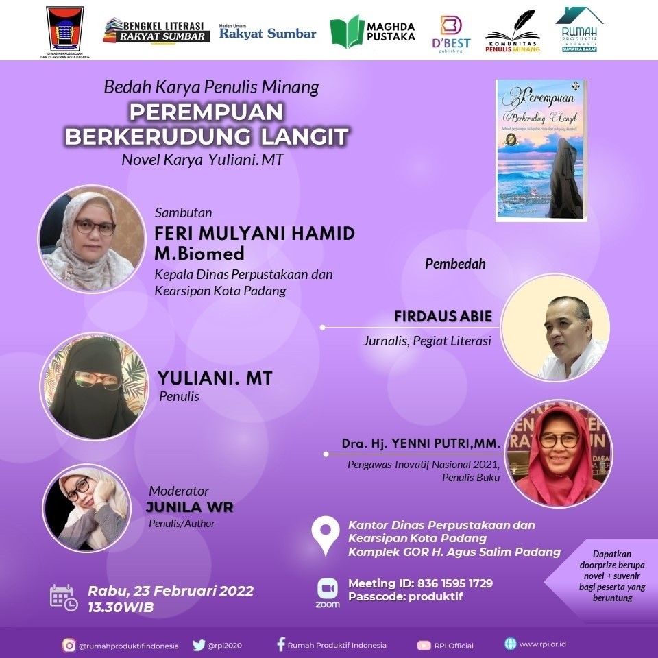 Padang, rakyatsumbar.id – Sebuah novel yang diangkat dari kisah nyata, Perempuan Berkerudung Langit, akan dibedah di Aula Dinas Perpustakaan dan Arsip Kota Padang, Rabu (23/2) besok. “Format bedah . . . 0